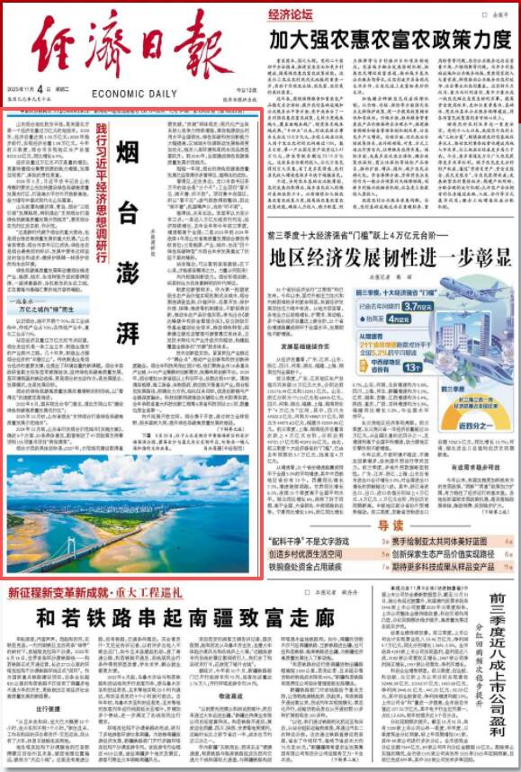 11月4日出版的《经济日报》在头版刊文《烟台澎湃》,文中称,2024年5月,习在山东考察时要求山东加快建设绿色低碳高水平发展先行区,打造高水平对外开放新高地,奋力谱写中国式现代化山东篇章。山东部署构建济南、青岛、烟台“三核引领”发展格局,特别提出“支持烟台打造绿色低碳高水平发展示范城市”,要求烟台在先行区走在前、作示范。今年前三季度,烟台市实现地区生产总值8223.52亿元,同比增长6.4%。经济总量过万亿元不仅是量的增加,更意味着烟台集聚资源的能力增强,发展空间更广,承担的责任更重。
